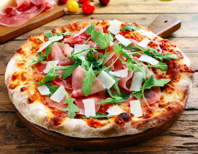 Tomato Sauce, Italian Raw Ham, Cherry Tomato, Arugula, Parmesan, Pesto, Mozzarella, Olive, Oregano