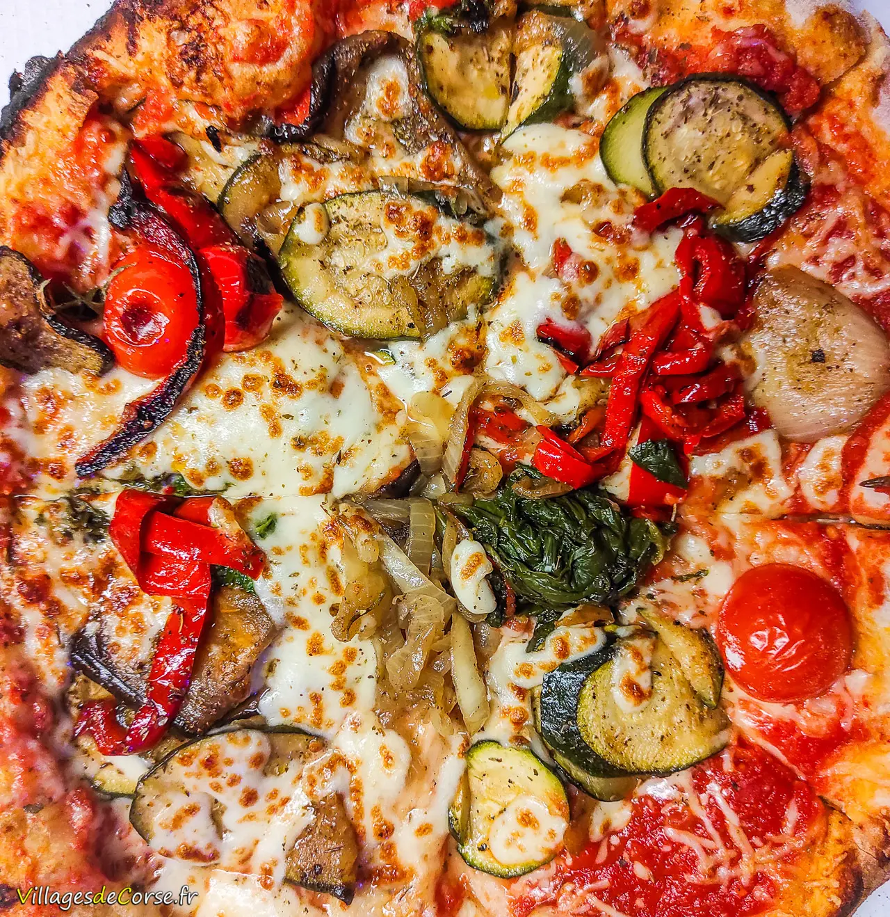 Sauce Tomate, Courgettes, Aubergines et Poivrons Marinés, Oignon, Persillade, Mozzarella, Olive, Origan