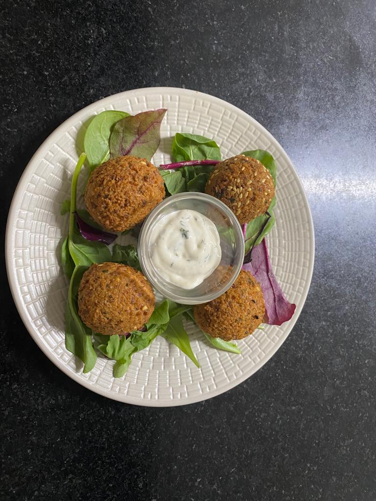 Broken falafels served on a bed of spring mix salad, Tomatoes, Radish and garnished with sesame seeds served with tarat…
