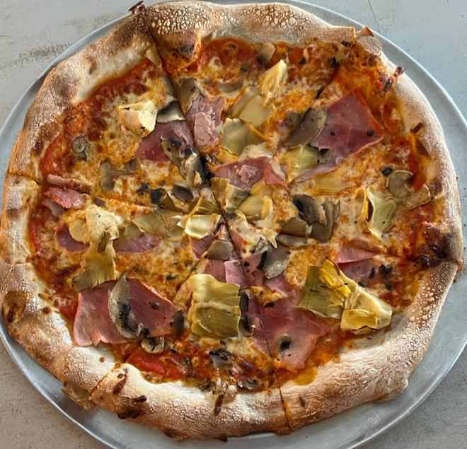 Marinara sauce, Mozzarella, Ham, Fresh mushroom, Artichokes,