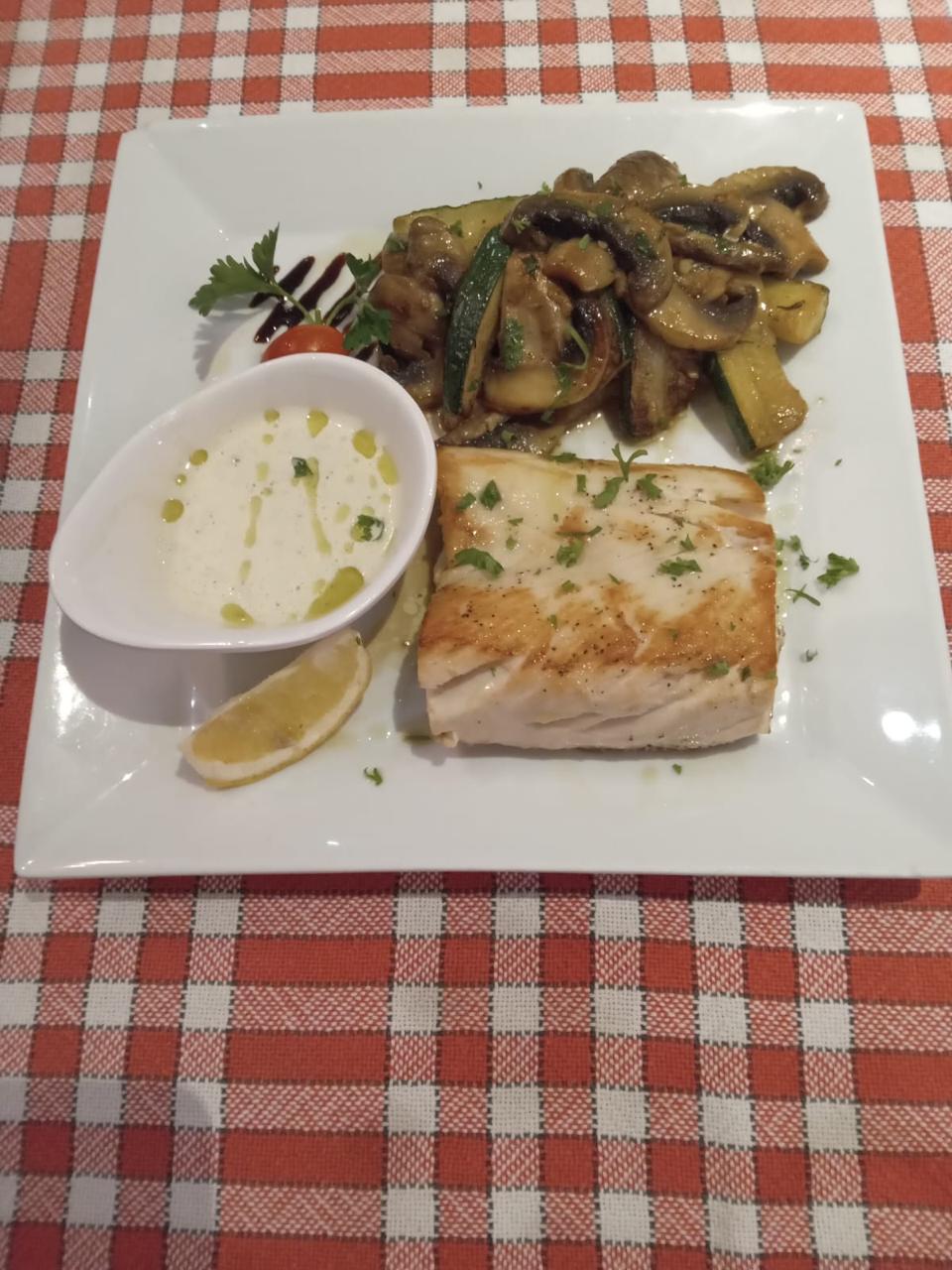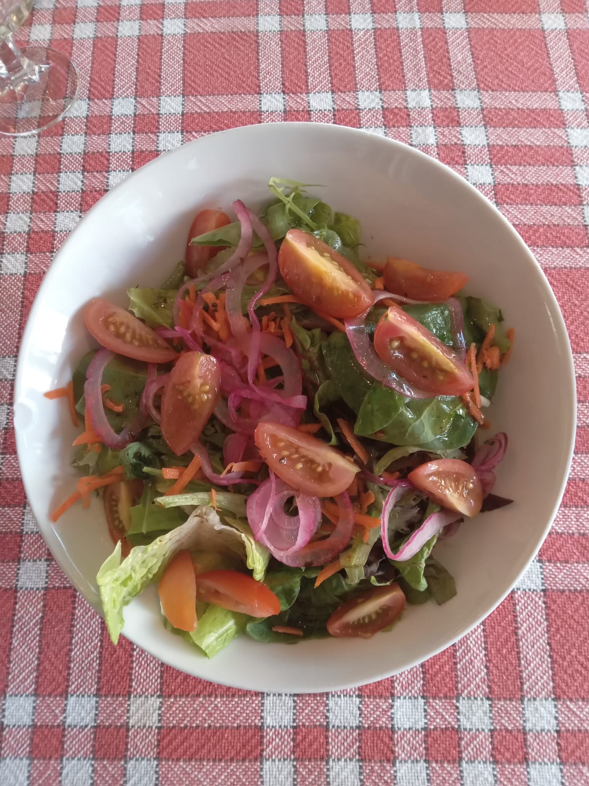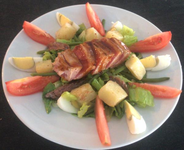 Green salad, Tomatoes, Potatoes, Anchovies, Hard-boiled egg, Grilled fresh tuna with teriyaki sauce