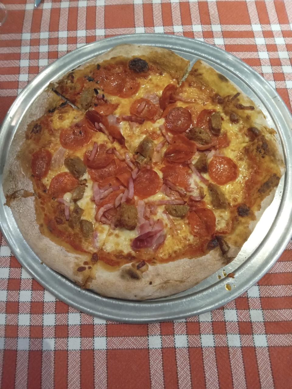 Marinara sauce, Mozzarella, Pepperonni, Spicy Italian sausage, Ham, Lardons