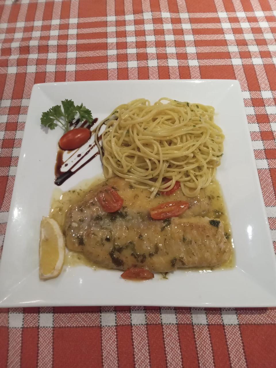 Breaded chicken breast with tomato sauce, Mozzarella, Parmesan, Grilled in the oven, Served with Tomato Pasta