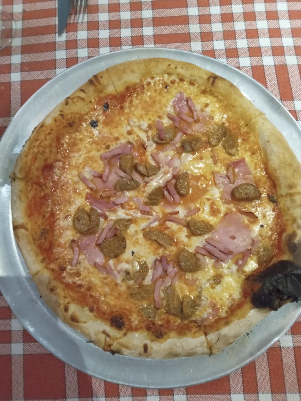 Marinara sauce, Mozzarella, Ham, Lardons, Spicy italian sausage