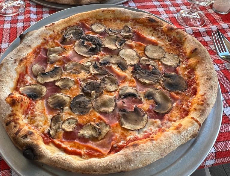 Marinara sauce, mozzarella, Ham, Fresh mushrooms