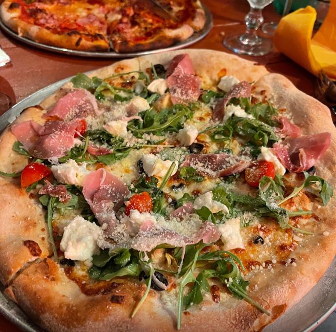 Garlic Sauce, Mozzarella, Olives, Proscuitto, Fresh Mozzarella, Artichoke, Arugula, Cherry Tomatoes, Parmesan