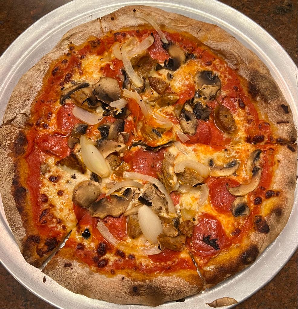 Marinara Sauce, Mozzarella, Fresh Mushrooms, Spicy Italian Sausage, Pepperoni, Onions