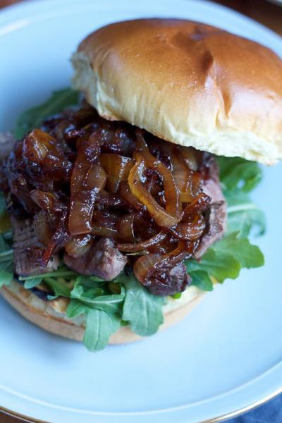 Caramelized Onions, Lettuce, Bleu Cheese Sauce, Fries