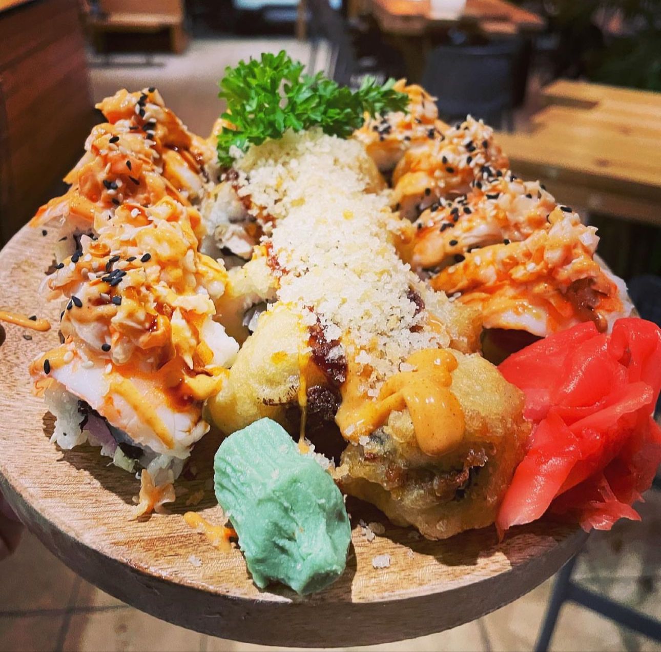 Lobster tempura, Avocado, Mango, Mint, Passion fruit citrus seasoning, Spicy top mayo, Mango cream, Tobiko