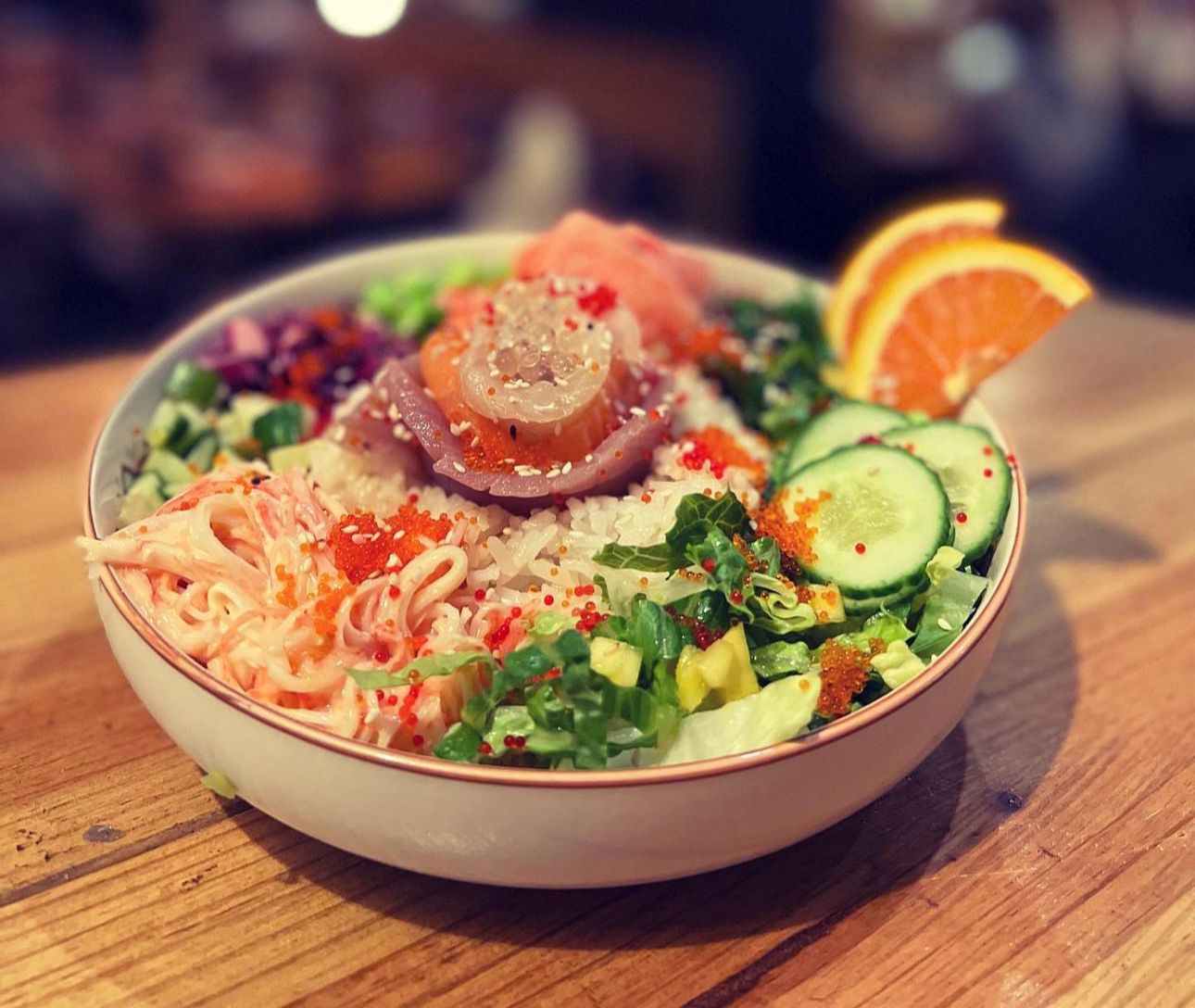 Tuna, Salmon and Amachi Rice bowl, Avocado, Cucumber, Edamame, Carrots, Red cabbage, Kanikama, Tobiko, Sesame, Wakame G…