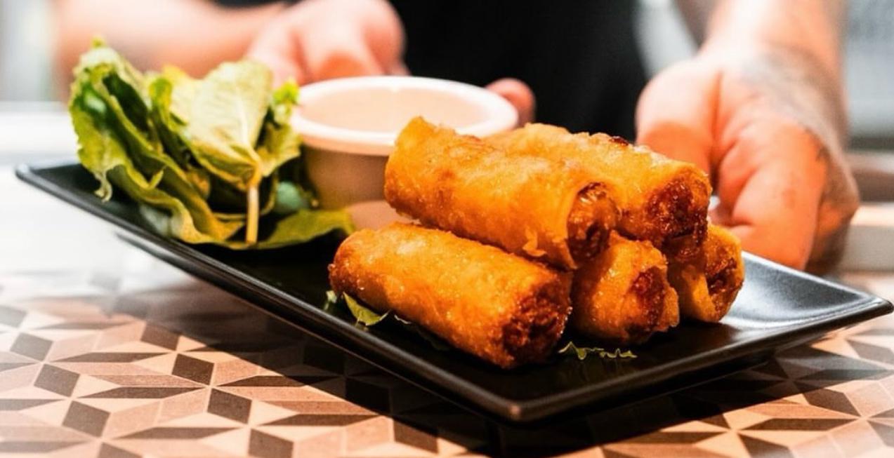 Green salad, Rice noodles, Mint, Coriander, Spring roll Peanuts, Sesame