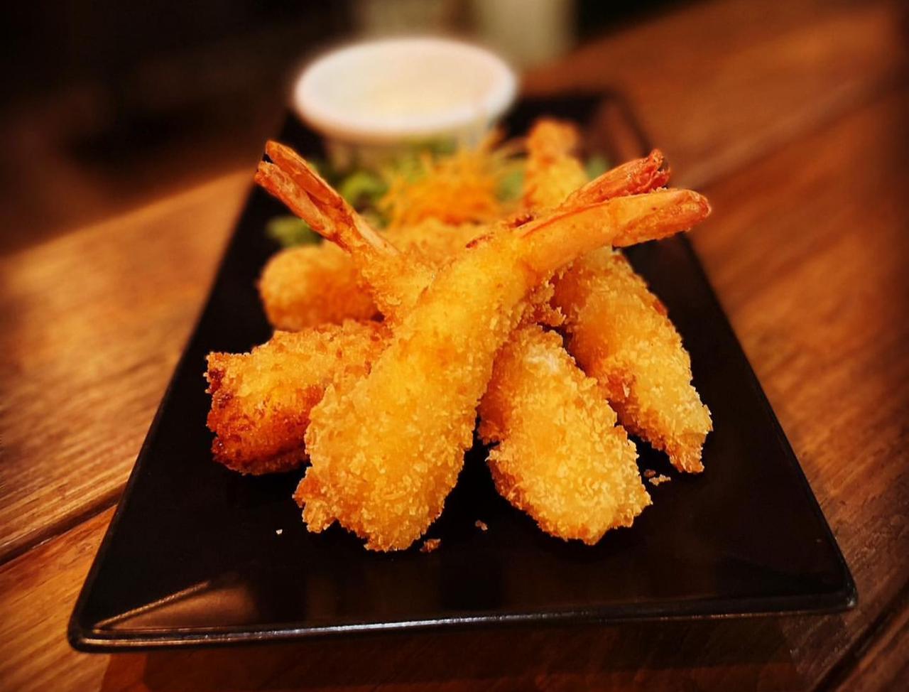 Breaded shrimp, Spicy tuna, Cream cheese, Avocado, Fried leeks, Sweet soy sauce, Tobiko, Spicy mayonnaise