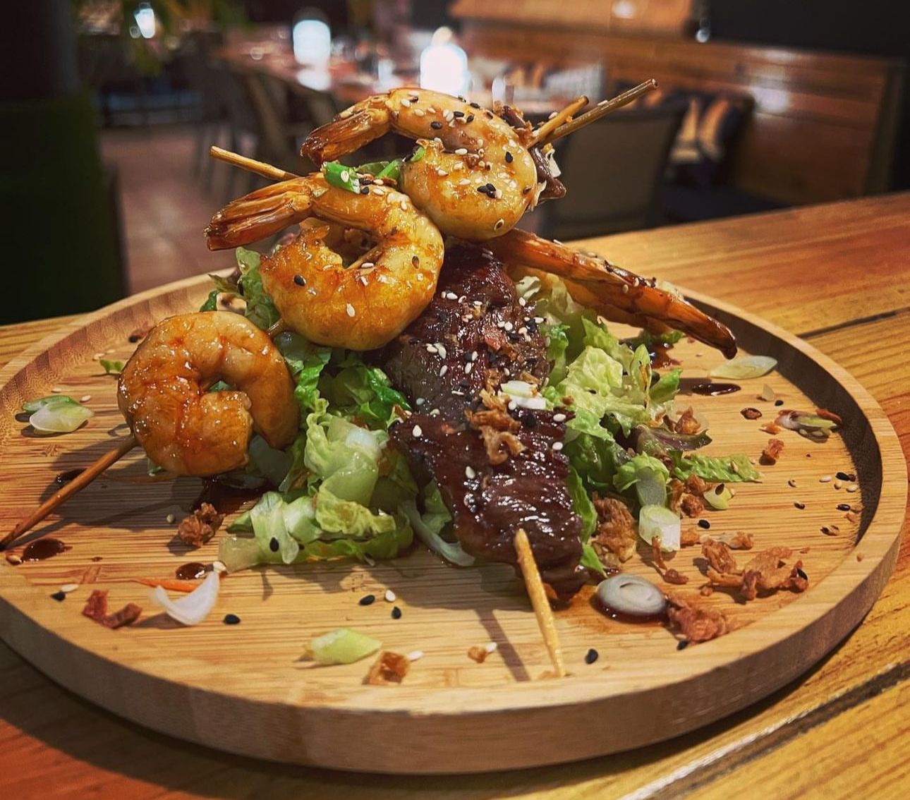 Beef marinated then snacked, Served in thin slices on a bed of arugula, Fried rice with vegetables, Peanuts, Garlic chi…