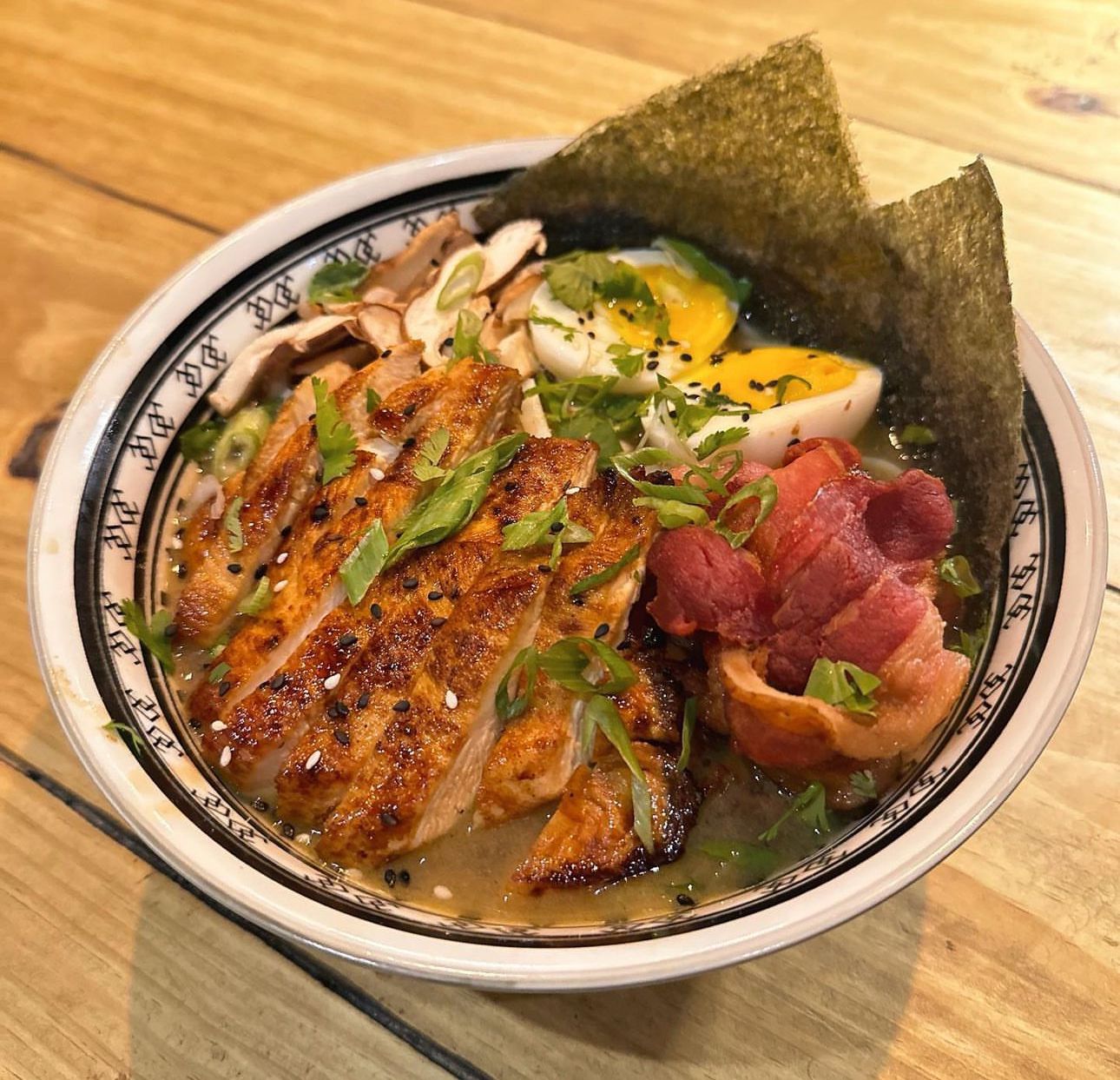 Soft-boiled egg Egg noodles, Nori, Shiitake, Chives, Cilantro, Grilled chicken, Bacon