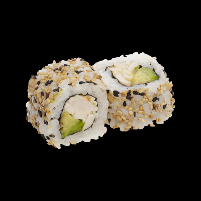 Breaded shrimp, Kanikama, Avocado, Cucumber, Top Kanikama, Spicy mayo, Sesame