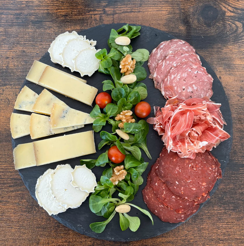 Charcuterie : Jambon Serrano 20 mois d'affinage, Chorizo de Bellota, Coppa.
